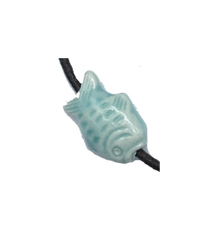 Pulsera montada sobre hilo de cuero encerado y acabada con figurita de porcelana en forma de pescadito