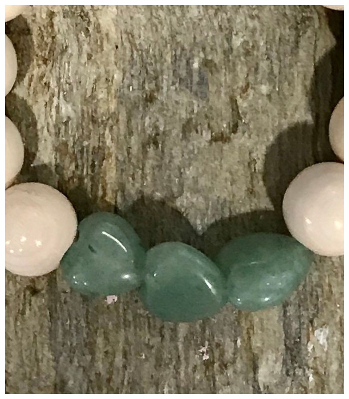 PRECIOSA pulsera de bolitas de madera blanca. En la parte central destacan tres piedras de Jade con forma de corazón, diseño exclusivo de Twenty Violets.