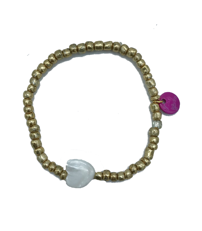 Exclusiva pulsera de pepitas de cristal - dorado o plateado - acabada en un pequeño corazón de nácar.